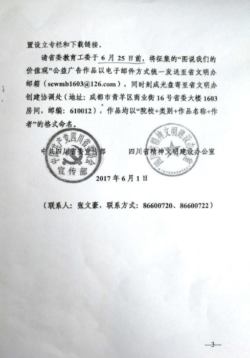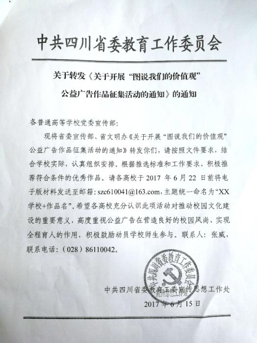 请按照文件要求结合公司专业特点根据推选标准和工作要求。积极推荐符合条件的优秀作品。请于2017年6月22日前将电子版材料发送至四川省委教育工委宣思处邮箱:szc610041@163.com。主题同意命名为“太阳成集团tyc7111cc+作品名”