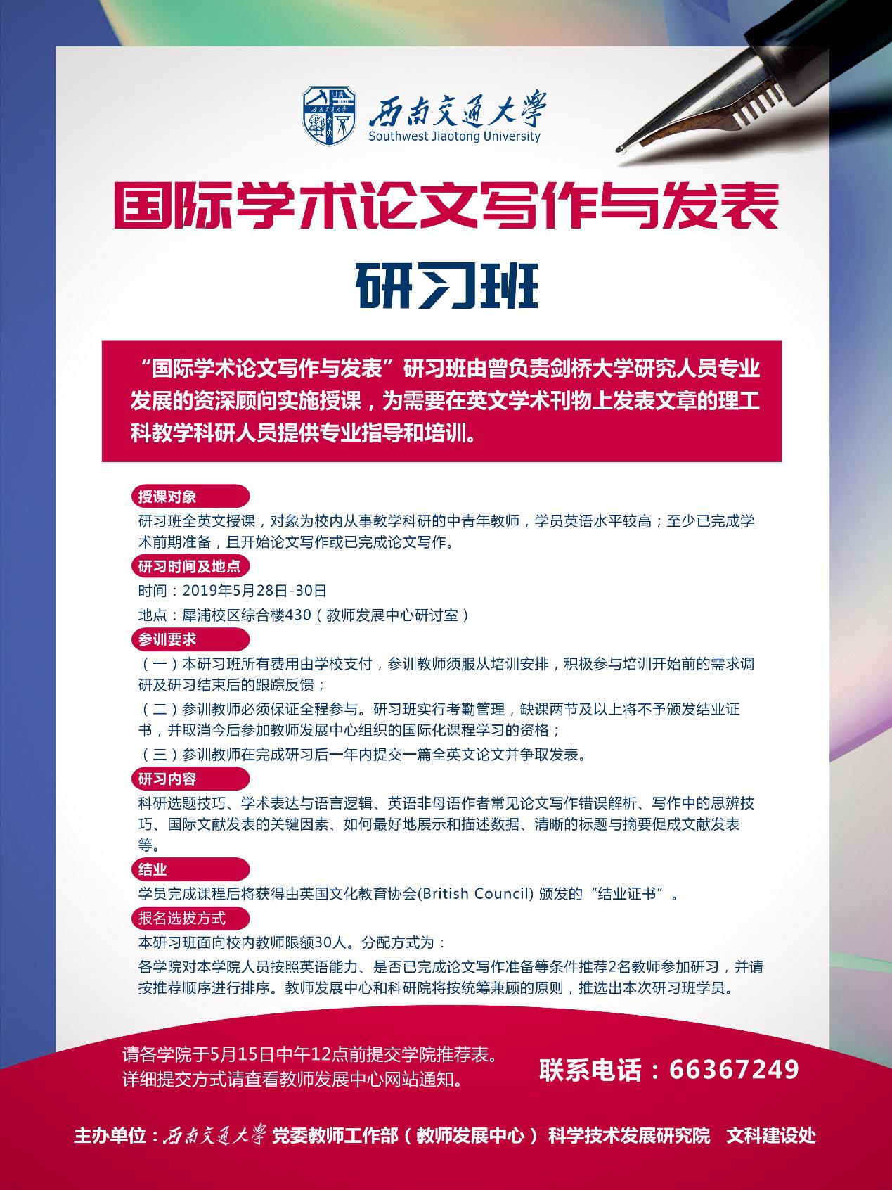 为推进实施公司国际化战略,提升教师科研的国际化水平,促进国际交流与合作,西南交大党委教师工作部(教师发展中心)和科学技术发展研究院联合英国领事馆文化教育处,引进国际学术论文写作与发表研习课程(Academic Writing for Publication)。现将有关事项通知如下:
