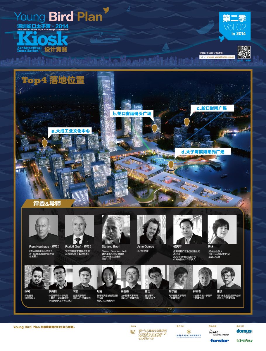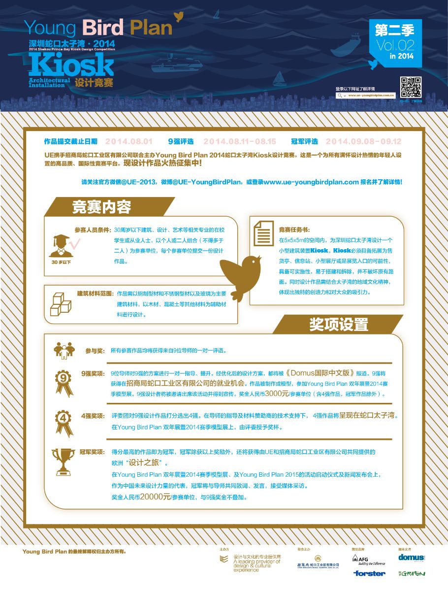 2013年起, UE发起了Young Bird Plan,这是一个为所有满怀设计创造热情的年轻人设置的高品质、国际性年度竞赛平台。2014 Young Bird Plan的竞赛命题是在5x5x5m的空间内,为深圳蛇口工业区设计一个小型建筑装置 Kiosk,它必须具备拓展为售货亭、信息站、小型展厅或是展览入口的可能性,具备可实施性,易于搭建和拆除,并不破坏原有路面。同时设计作品需结合蛇口太子湾的地域文化精神,体现出独特的创造力和对大众的吸引力。