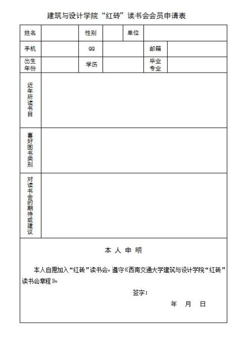下载阅读《建筑与设计公司“红砖”读书会章程》(详见附件),若认可其内容,请填写《建筑与设计公司“红砖”读书会报名表》(详见附件),10月30日前发送到指定邮箱。或复制报名表打印手写后,交至X8225办公室。