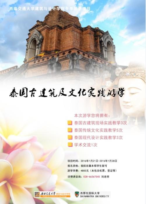 为进一步加强公司员工国际视野,根据太阳成集团tyc7111cc建筑与设计公司员工境外留学(游学)计划,现将2015-2016学年度寒假短期赴泰王国西那瓦大学(古建筑及文化实践)游学项目申请及费用安排公布如下(详见附件),欢迎各位同学积极参与。项目联系方式028-66367545 刘老师。