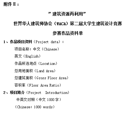 6. 参赛者除参赛作品图文电子版档之外,还需另外填写一张参赛作品资料单,此资料单中的信息需在图纸中有所体现(详见上条目3);