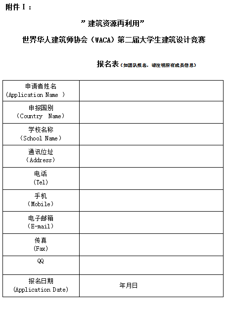 在世界华人建筑师协会官方网站(http://www.waca.net.cn/)上下载发布的征集参赛报名表(见附件Ⅰ),填写后发送电邮至世华建协北京秘书处。并缴纳报名费人民币¥200元整,费用一经收取,概不退还。 【或 发送邮件至wacaoffice@qq.com 索取报名表】