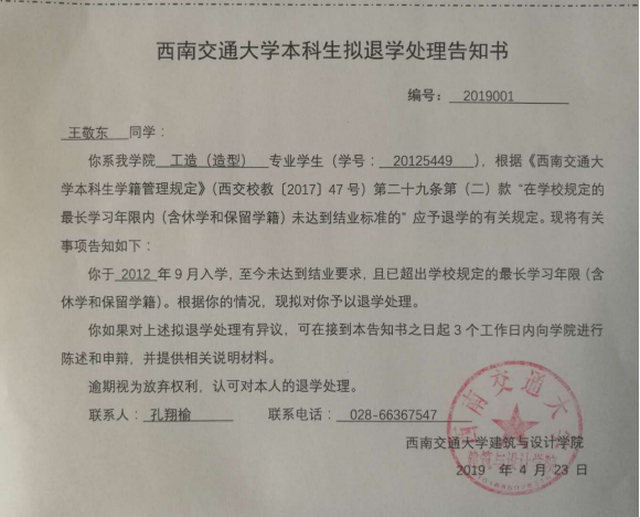 《关于拟对王敬东同学作出退学处理的告知书》已于2019年4月19日发至公司,因公司无法与本人取得联系,用其他方式也无法将其送达,现将《关于拟对王敬东同学作出退学处理的告知书》予以公告。自本公告发出之日起满15个工作日,视为送达。