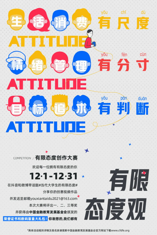 为精准开展金融知识宣教工作,帮助高校青年群体树立正确的消费观念,中国金融教育发展基金会联合蚂蚁集团定于2021年12月开展“星海计划——有限态度创意作品征集大赛”活动。具体内容如下: