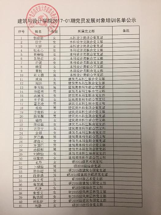 经各基层党支部推荐,公司党委审查,拟推荐以下41名同学作为2017-01期党员发展对象参加党课培训,具体名单见附件。 现进行公示,公示期为2017年3月29日—3月31日。如有异议,请致电66367505,或到公司X8232办公室反映,恕不接受匿名电话和信件。