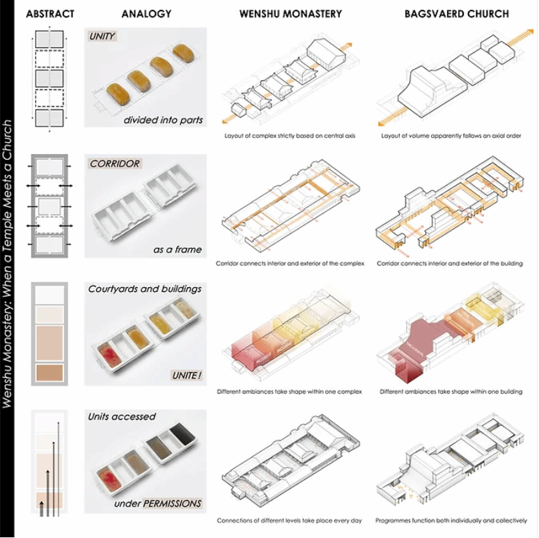 本次Archiol 国际论文竞赛以发掘探索世界各地的temple建筑为题,temple不仅包括东亚的佛教寺庙,还涵盖了从古希腊帕特农神庙、印度的印度教神庙,到东南亚吴哥窟等等。公司师生团队的论文《文殊院:当寺庙遇见教堂》很好地呼应了temple内涵的国际性和多样性。文章打破建筑史叙事常规,从建筑空间角度总结了四条设计原则,比较分析了不同文化背景下传统寺庙和现代教堂在形式逻辑和使用功能上的共性。