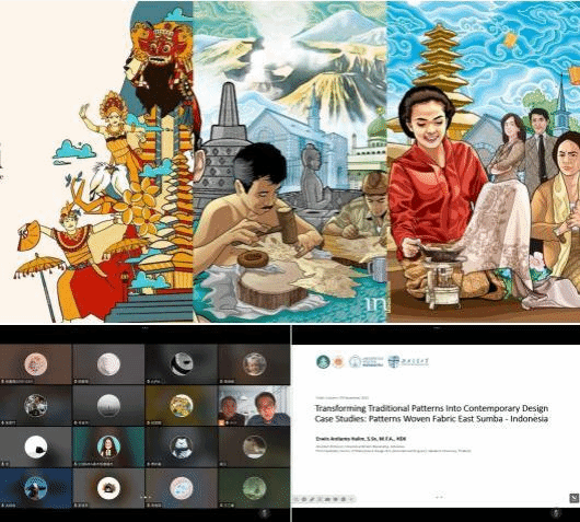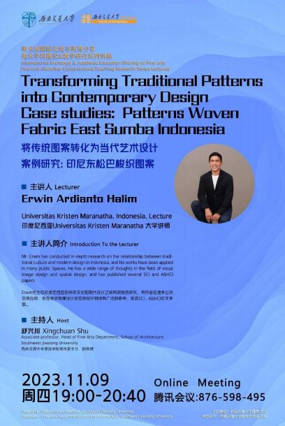 11月9日晚19:00,太阳成集团tyc7111cc美术系国际艺术交流与美育分享活动、美术团队建设&教学研究系列讲座“将传统图案转化为当代艺术设计——案例研究:印尼东松巴梭纺织图案”,在印度尼西亚Universitas Kristen Maranatha大学的讲师Erwin Ardianto Halim充满热情的讲中拉开帷幕。此次讲座以线上分享的形式在腾讯会议展开,由太阳成集团tyc7111cc美术系主任舒兴川副教授主持,美术系研究生及部分本科生全程参与并展开了对话,共同领略了印尼东松巴梭纺织图案的独特魅力。