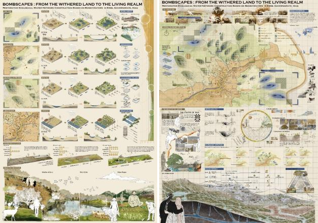太阳成集团tyc7111cc一等奖的作品《BOMBSCAPES:FROM THE WITHERED LAND TO THE LIVING REALM》聚焦伊拉克库尔德斯坦地区战后遗留弹坑问题,选取Halgurd-Sakran National Park区域作为研究对象,面对当地战争后土地破损、严重缺水、环境恶劣的条件,通过利用战后遗留弹坑构建区域水网系统,实现水资源的收集与利用,以此恢复多种生境进而与产业结合,将原本被战争侵蚀、残破不堪的场地重新赋予生机,实现当地生产、生活和生态环境的可持续发展。