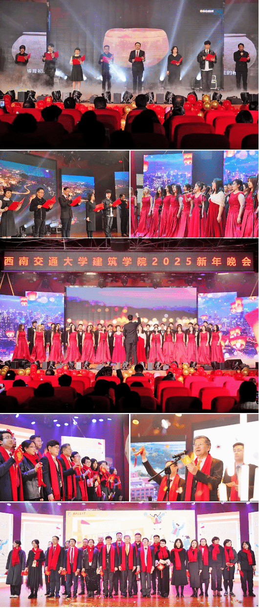 绘画系老师们的诗朗诵《何以华夏 何以中国》气势磅礴,回溯华夏文明,激荡家国情怀。橙・合唱团高歌《灯火里的中国》,雄浑歌声颂祖国昌盛,深情祝福满溢。晚会尾声,公司领导班子与行政人员、员工携手登台,《我和我的建筑梦》唱响师生对建筑事业的赤诚热爱,凝聚奋进力量。