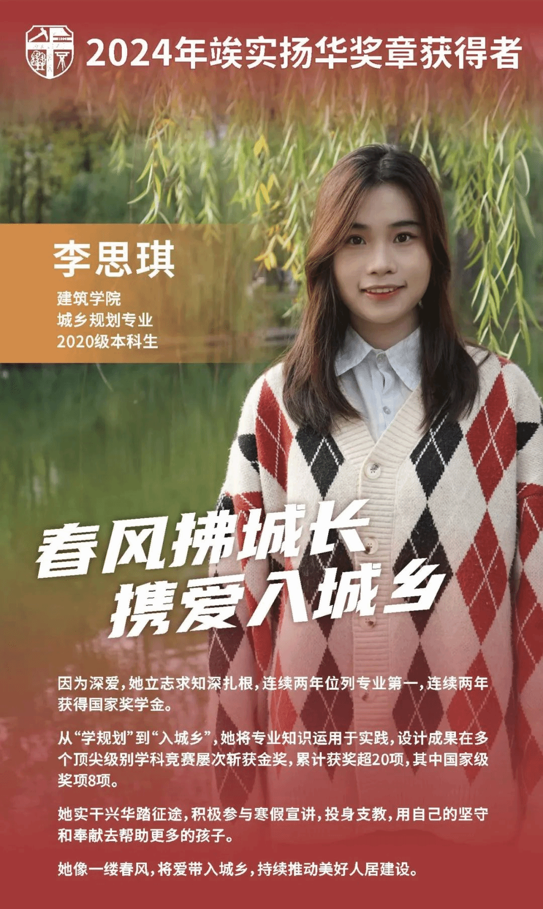 以满心热爱诠释青春担当,如一缕春风将爱带入城乡,将实践力行深入到爱家国、爱城乡、爱交大、爱生活的方方面面。李思琪的交大“城”长故事里,有弘扬传统,焕活文化;有学以致用,改造城乡;有助学助困,赤诚奉献;有脚踏热土,向上生长……
