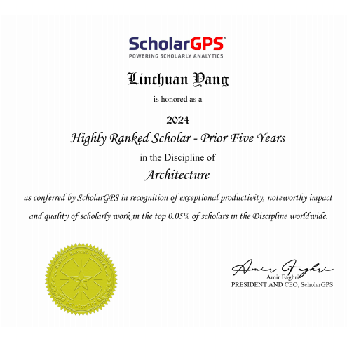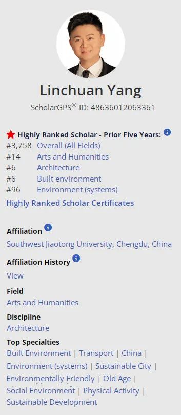 太阳成集团tyc7111cc杨林川教授成功入选全球前0.05%顶尖学者近五年榜单,在建筑学科(Discipline: Architecture)和建成环境专业(Specialty: Built Environment)两个榜单中均排位全球第六。