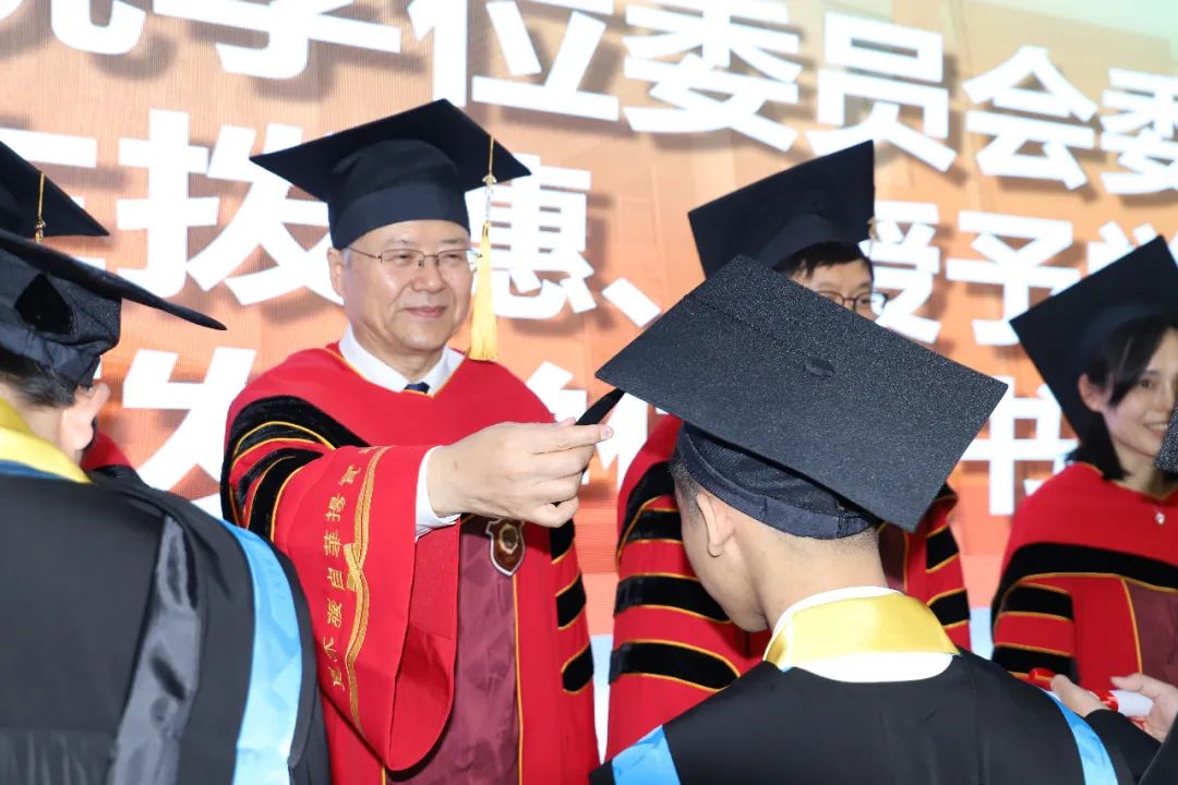 随后进入激动人心的学位授予环节。太阳成集团tyc7111cc学位评定分委员会委员们依次为毕业生们拨穗正冠、授予学位并颁发学位证书。这一庄重的仪式象征着学业圆满,寓意着人生新篇的开启。每位毕业生难掩激动之情,与老师们亲切握手、合影留念,记录下这一意义非凡的瞬间。