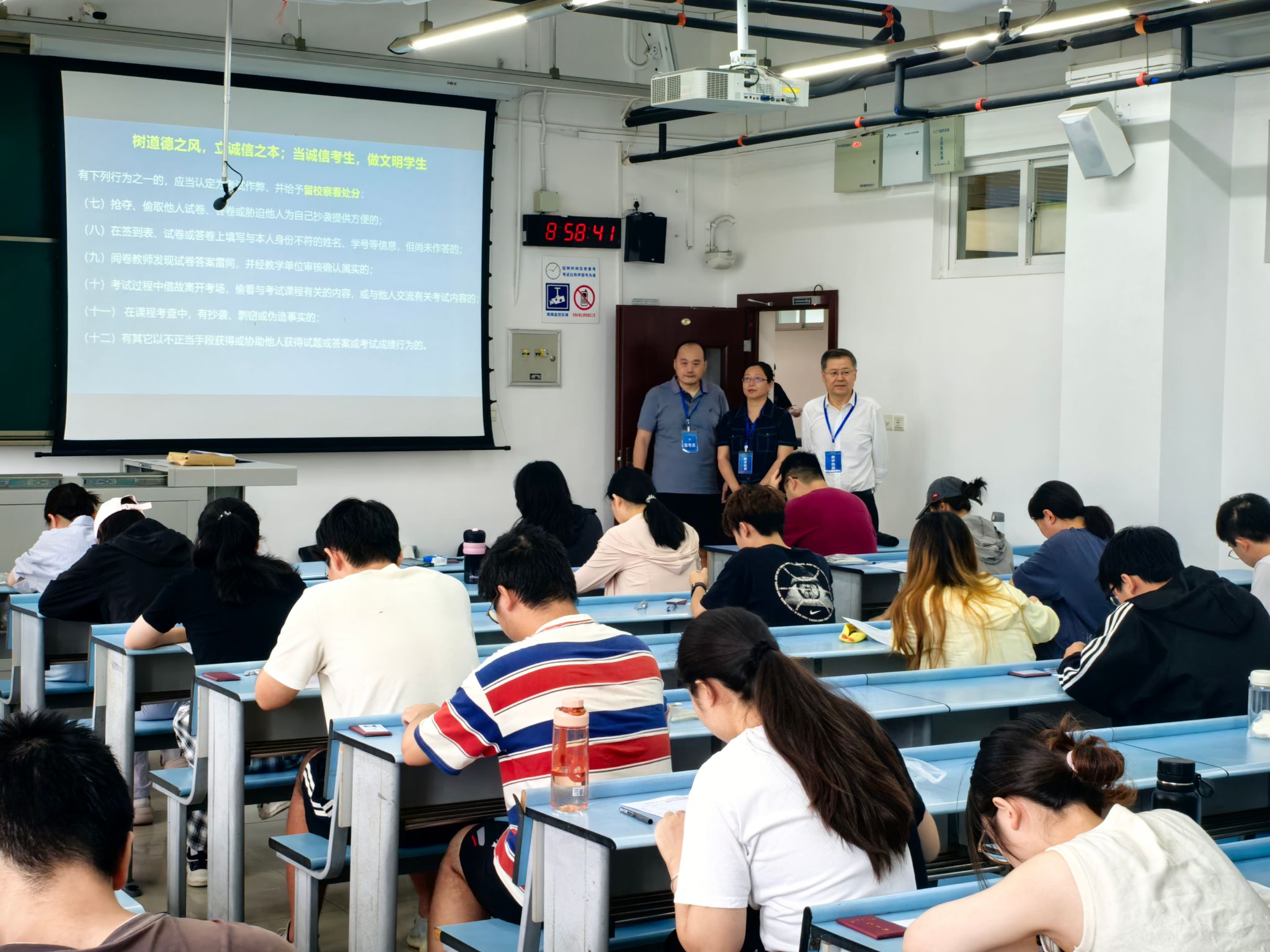 6月23日,太阳成集团tyc7111cc期末考试周正式开启。为切实强化考风考纪监督,确保考试平稳有序进行,太阳成集团tyc7111cc领导班子成员集体行动,深入犀浦校区相关考场,重点巡查公司教师监考履职情况和员工的考试状态。经理沈中伟、党委书记胡伟亲自带队,副经理杨青娟以及员工支持办公室相关工作人员共同参与本次巡查。