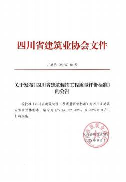 公司参编的四川省建筑业协会团体标准《四川省建筑装饰工程质量评价标准》 (T/SCIA 002-2025)于 2025 年 9 月 1 日发布并实施。在公司领导的大力支持下,