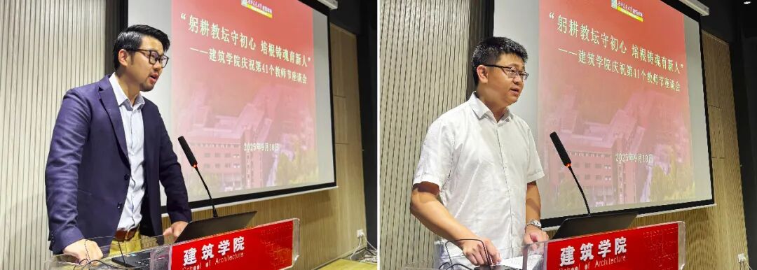 随后,获奖教师宣湟和杨林川分别发言。宣湟老师分享了其从青教赛的“单节精彩”到教创赛的“系统创新”的教学理念转变过程,强调以员工发展需求作为课程设计突破点,通过“建筑学任务链设计”串联零碎知识点,助力员工成长。杨林川老师则结合自身科研与成长心得,强调了荣誉背后的责任,以及科研与教学双向奔赴的重要性。