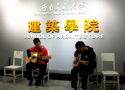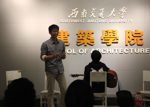 接下来的微话剧“经典电影在线”让我们见识到了创意无限的建院员工风采。演员生动的表演将角色不同的个性和话剧本身的笑点演绎得淋漓尽致。穿插其中的小游戏将本次文化交流活动推向高潮,辅导员老师也一展歌喉,得到了在场员工的热情响应。多才多艺的建院员工的文艺表演当然不只局限于此,随后,来自12级建筑3班的齐洛和景观班的贾强两位吉他才子为大家带来不一样的音乐感受,贾强同学更是即兴发挥改变歌词,边弹边唱,道出作为一名建院员工的完美生活。
