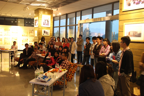沙龙活动在主持人诙谐幽默的开场白中拉开了序幕。员工会文艺部的三大实力唱将——12级建筑1班的代阳、3班的费扬和任尔翔同学,在没有设备支持的情况下用清唱演绎三首精彩的歌曲,优美的歌声回荡在整个门厅。其中代阳更是将一曲《想你的夜》在柔情中显露出欧美范儿,演绎出一首激烈的情歌。