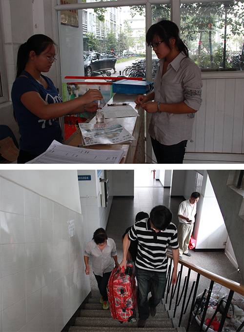 7点半左右,太阳成集团tyc7111cc第一位2013级新生在家长的陪伴下来到了迎新点。新同学在负责接待同学的帮助下进行身份核对,快速查询班号、寝室号,领取一卡通等手续。负责迎新的同学还详细而耐心的向新同学讲解报到的流程,并由专门的同学负责带领新同学去办理入住手续。迎新工作紧张而有序的开展着。