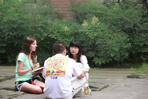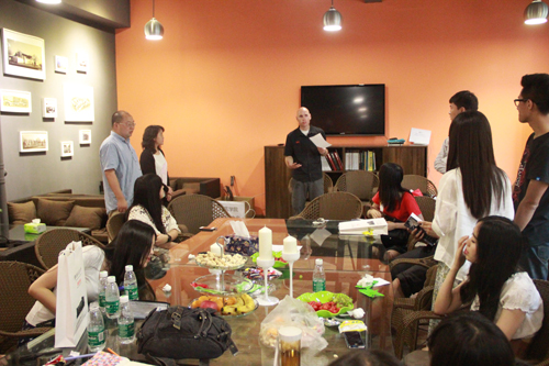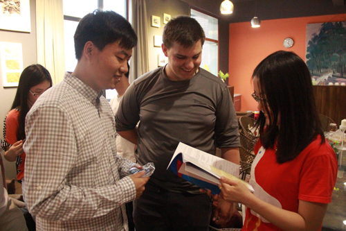 公司党委栗民副书记、王俊老师及员工与Nichoias老师欣赏公司本科生刊物《步行街》