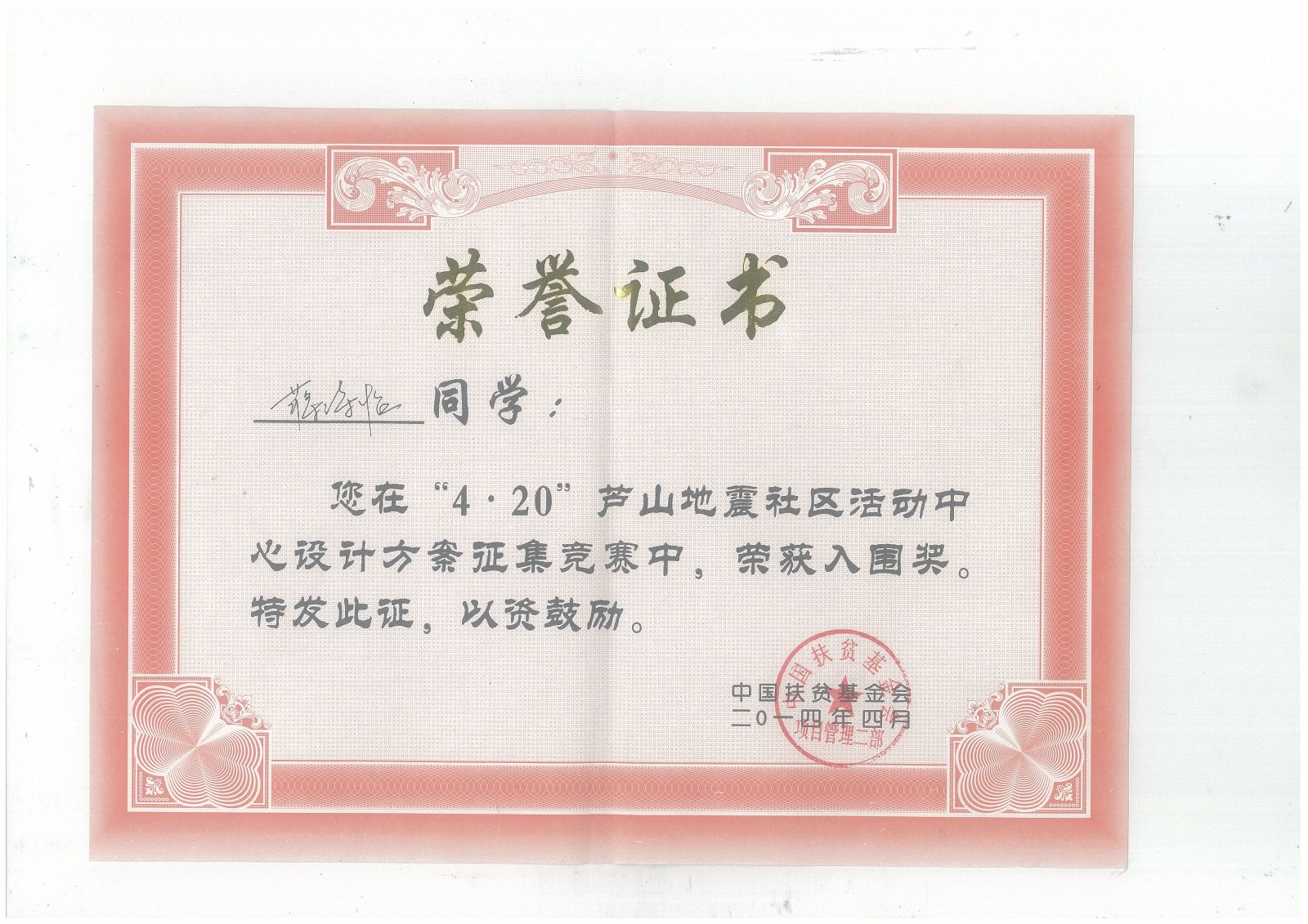 中国扶贫基金会、共青团四川省委共同举办的“4.20”芦山地震灾后重建社区活动中心设计方案征集竞赛,旨在为加强灾区基层文化建设,丰富灾区群众文化生活,鼓励灾区群众走出家门、融入社区,并培养优秀的青年设计人才。公司员工团队,以“疗养空间”为设计理念的天全县老场乡红岩村社区活动中心方案最终获得入围奖(最高奖),全国获得入围奖的共六项方案。