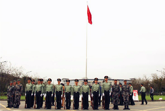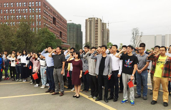 2013级国防生党支部党员代表曾珍同学在国旗下发言,并带领新党员宣读入党誓词:“我志愿加入中国共产党,拥护党的纲领,遵守党的章程,履行党员义务,执行党的决定,严守党的纪律,保守党的秘密,对党忠诚,积极工作,为共产主义奋斗终身,随时准备为党和人民牺牲一切,永不叛党。”预备党员们高举右手,朗声宣读。随后,在场领导、老师及员工党员在横幅上签下自己的名字,表达后辈对祖国繁荣昌盛的由衷祝福,并承诺在今后的学习、工作中继续努力、艰苦奋斗,为公司、公司发展作出自己的努力,为社会建设作出贡献。