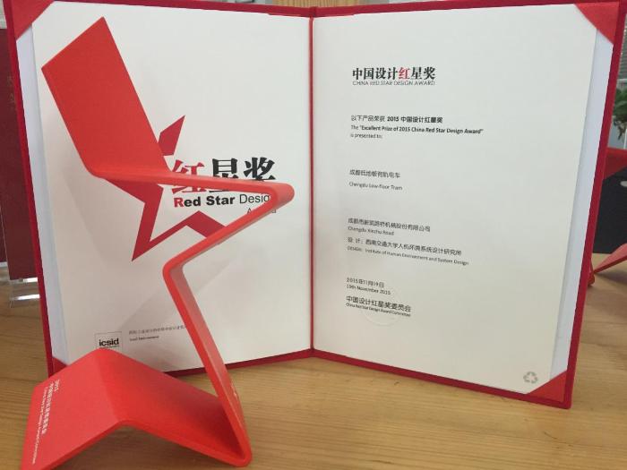 11月19日下午,在北京举办的“2015中国设计红星奖颁奖典礼”上,建筑与设计公司人机环境系统设计研究所团队作品《成都低地板有轨电车》、《200km/h客运机车外形及驾驶室设计》、《“鱼骨”桥梁设计》再获“2015中国设计红星奖”。这是该团队继2012,2013年两次获得红星奖以来,第三次获此殊荣。