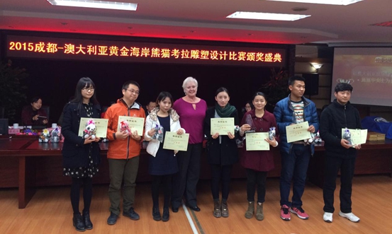 12月10日下午,在四川师范大学举行的“2015成都-澳大利亚黄金海岸熊猫考拉雕塑设计比赛颁奖典礼”传出喜讯。公司美术系黄焰微同学的作品获得二等奖,闫腾佳、侯钱和周瀛瀛同学的作品分获两项三等奖。四川师范大学董事长丁任重、成都市外侨办副主任卢伟良、澳大利亚驻成都总领事馆副领事共同为中澳双方的获奖团队颁奖。