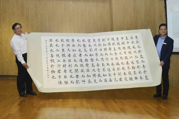 随后,刘洪生感谢公司提供了本次书法学习交流的机会和平台,他期待以后能有更多的机会和大家一起交流。刘洪生现场向公司赠送了他的书法作品《劝学》,希望该作品能为公司师生的艺术创作带来力量与灵感。随后公司领导及建筑与设计公司领导为该书法作品颁发收藏证书。