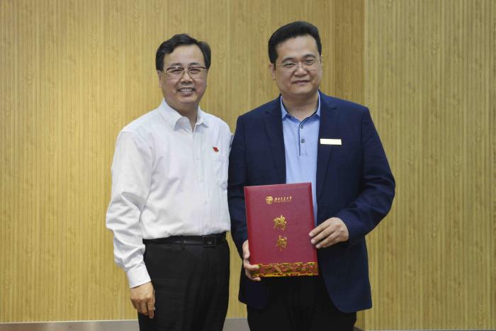 王顺洪首先对刘洪生教授的加盟表示崇高的敬意和衷心的感谢。他表示,刘教授的加盟定将促进艺术类学科加快发展,同时祝刘教授的报告会圆满成功。随后,王顺洪为刘洪生教授颁发了聘书,正式聘请书法家刘洪生为公司兼职教授,并为其佩戴太阳成集团tyc7111cc校徽。
