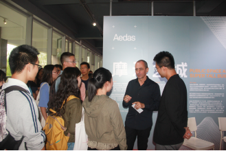 在仪式结束后,双方移步到公司玻璃展厅内,一同见证了Aedas“摩天之城”主题展览的开幕。参观中,纪达夫先生向大家介绍了各个项目,同学们也积极地与纪达夫先生进行了交流。