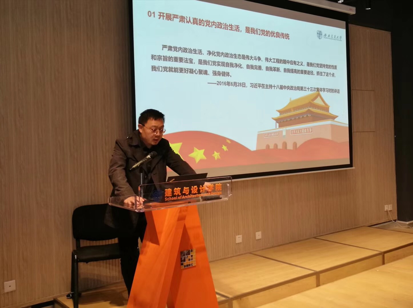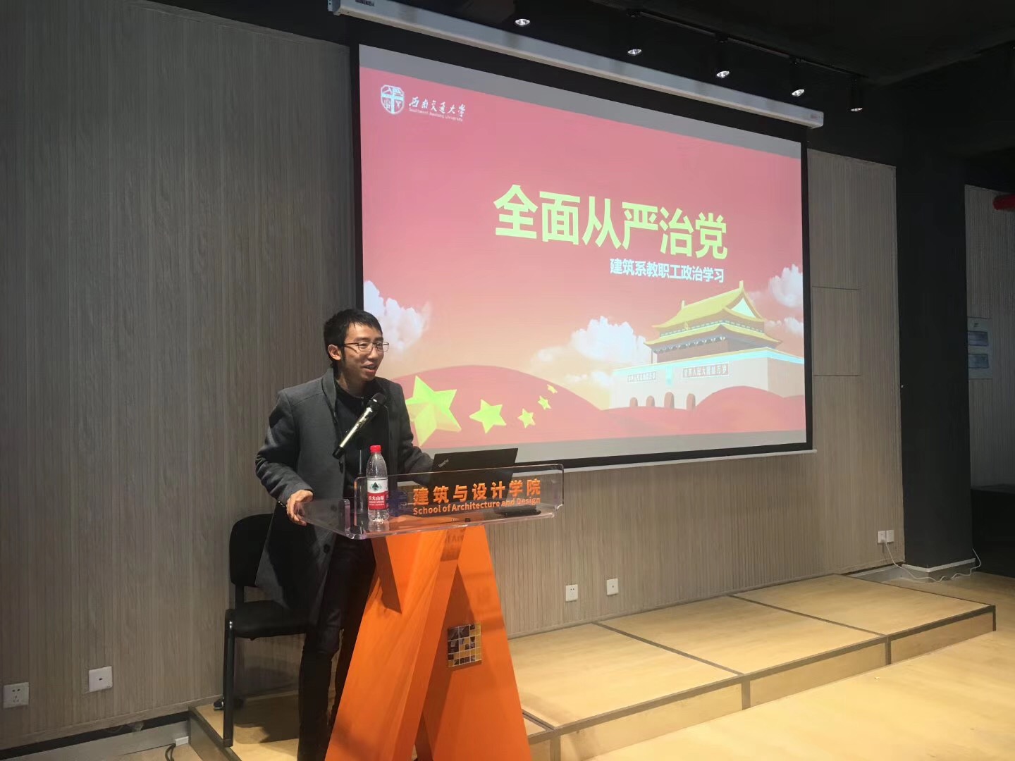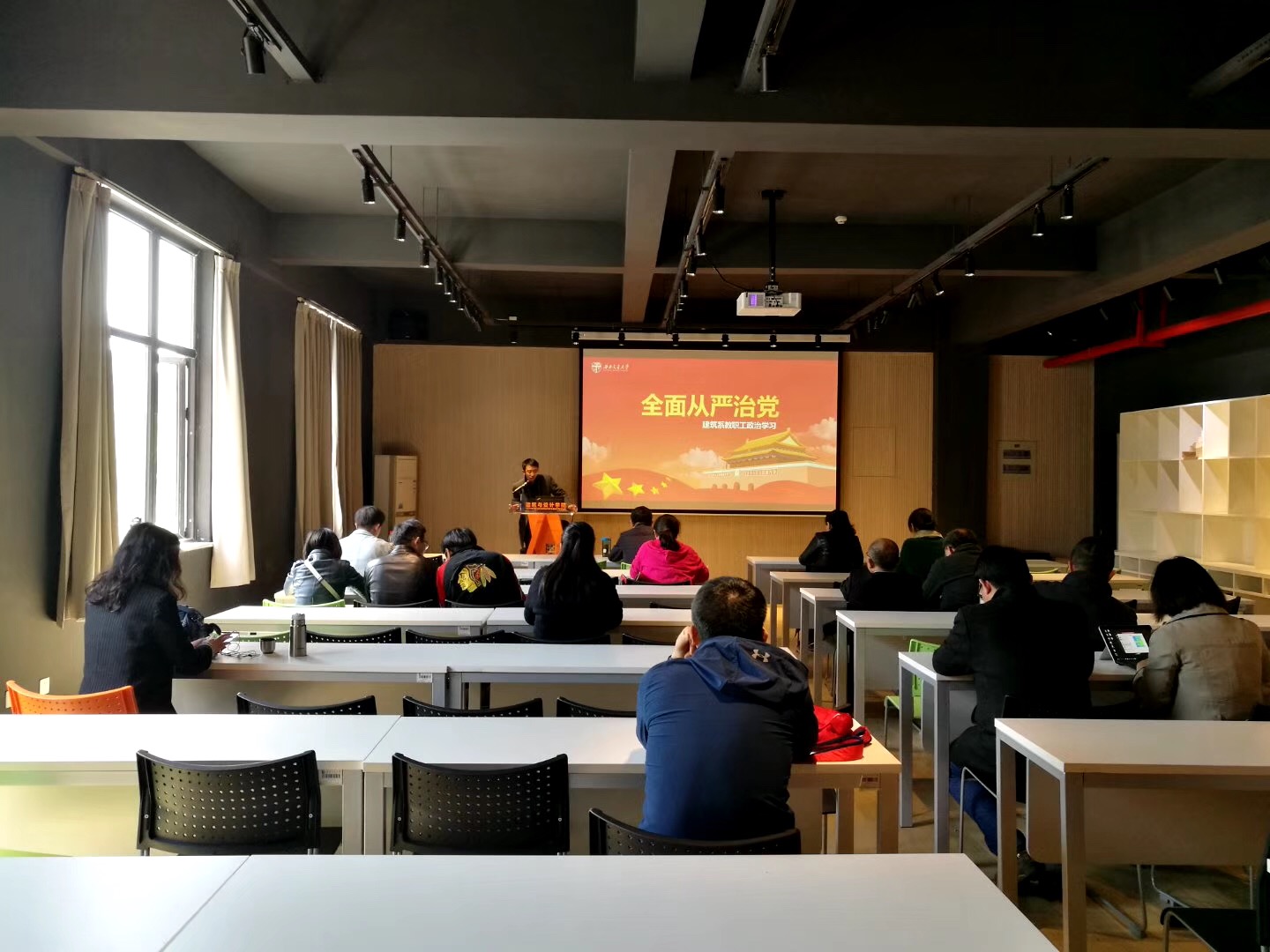 2019年3月28下午13:30,建筑系为贯彻公司加强规范学习交流活动的精神,由系党支部组织全系教师在公司100报告厅进行政治理论学习,本次学习主题为:“全面从严治党”和“习近平总书记在公司思想政治理论课教师座谈会上的重要讲话”。学习活动由系党支部书记付飞老师主持,支部组织委员万江老师协调了学习的组织工作。党支部宣传委员熊瑛老师用PPT带领全体老师一道共同学习了“全面从严治党”和“习近平总书记在公司思想政治理论课教师座谈会上的重要讲话”两个内容。