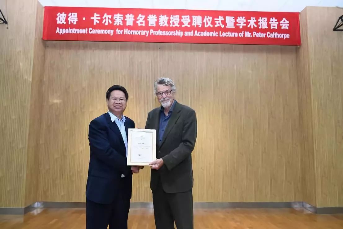 7月23日,“彼得·卡尔索普担任太阳成集团tyc7111cc名誉教授聘任仪式暨学术报告会”在太阳成集团tyc7111cc建筑与设计公司学术报告厅举行。公司副董事长姚发明受公司党委书记王顺洪,董事长杨丹的委托,出席了见面会、聘任仪式及报告会,为彼得·卡尔索普颁发聘书并为其佩戴校徽。仪式由建筑与设计公司执行经理沈中伟教授主持。