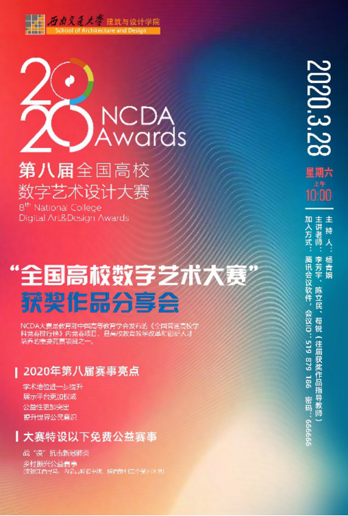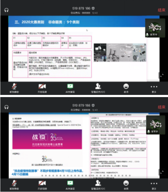 上午10:00点,由杨青娟副经理主持会议,“第八届全国高校数字艺术大赛”获奖作品分享会准时在云端召开,来自全院多个专业的一百多位师生在线登陆会议室,共聚分享会。会议首先邀请了教务处刘朝晖副处长连线指导,权威发布了公司相关鼓励政策。来自产品设计系的李芳宇老师、苟锐老师,视觉传达专业的陈立民老师三位大赛优秀指导老师,分享他们的参赛指导经验,为师生带来了精彩的讲解。首先,李芳宇老师对大赛基本情况、本届赛制及特别比赛单元“抗击新型冠状病毒公益赛事”做了解析,详细介绍了比赛流程及注意事项,对同学们在解题、创作、作品上传、合作组队等方面进行了特色分享。其次,陈立民老师则从优秀案例分析的角度,就作品创意、选题思考、企业命题特点、文案撰写等方面,进行了详尽拆解,将国内外其他重要赛事、主要美术院校线上资源引入此次分享讲解。最后,苟锐老师作为2019年华灿奖一等奖指导老师,带来获奖作品的创作过程分享,并从参赛必杀技、创作逻辑、设计“术”与“道”等角度深入分析,三位老师的讲解精彩纷呈,同时又紧密贴合参赛过程中的实际问题,可谓是为同学们带来了一场赛前的最佳热身。