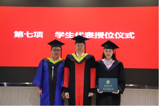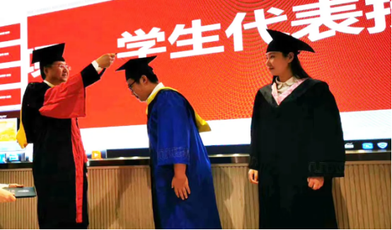 四载励志求学,一朝鲲鹏展翅。在高亢的音乐声中,毕业生学位授予仪式正式开始,沈中伟经理为公司毕业生代表拨穗,并颁发学位证书、合影留念,将典礼的气氛推向高潮。