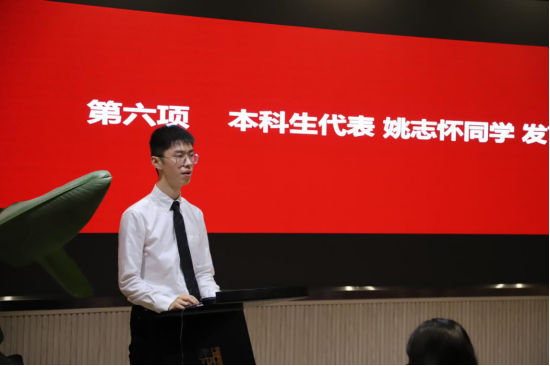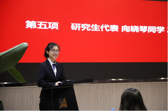 教师代表苟锐老师也向全体毕业生表达祝福,希望毕业生们离开母校后依旧保持敦笃励志的赤子之心,精勤求学的作风和豁达开朗的性情,不畏浮云遮望眼,笃实开创美好未来。离别之际,研究生毕业生代表向晓琴表示,硕士阶段的研究和学习,从来都不是与世隔绝的桃花源地,有压力、有人情世故和生活的艰辛,但却这是一个把梦想变成现实,一个认识自我、挑战自我的过程。读研是选择的是一种生活方式、一种生活态度,而在公司的三年时间,让自身更加坚固、外表更加光亮,更好的未来全新旅程,本科毕业生代表姚志怀认为,毕业并不代表结束,而是欢呼的开始,不是庆祝完成,而是宣布进步,踏入社会的毕业生将一切归零,在一个新的起点走向社会的大舞台。