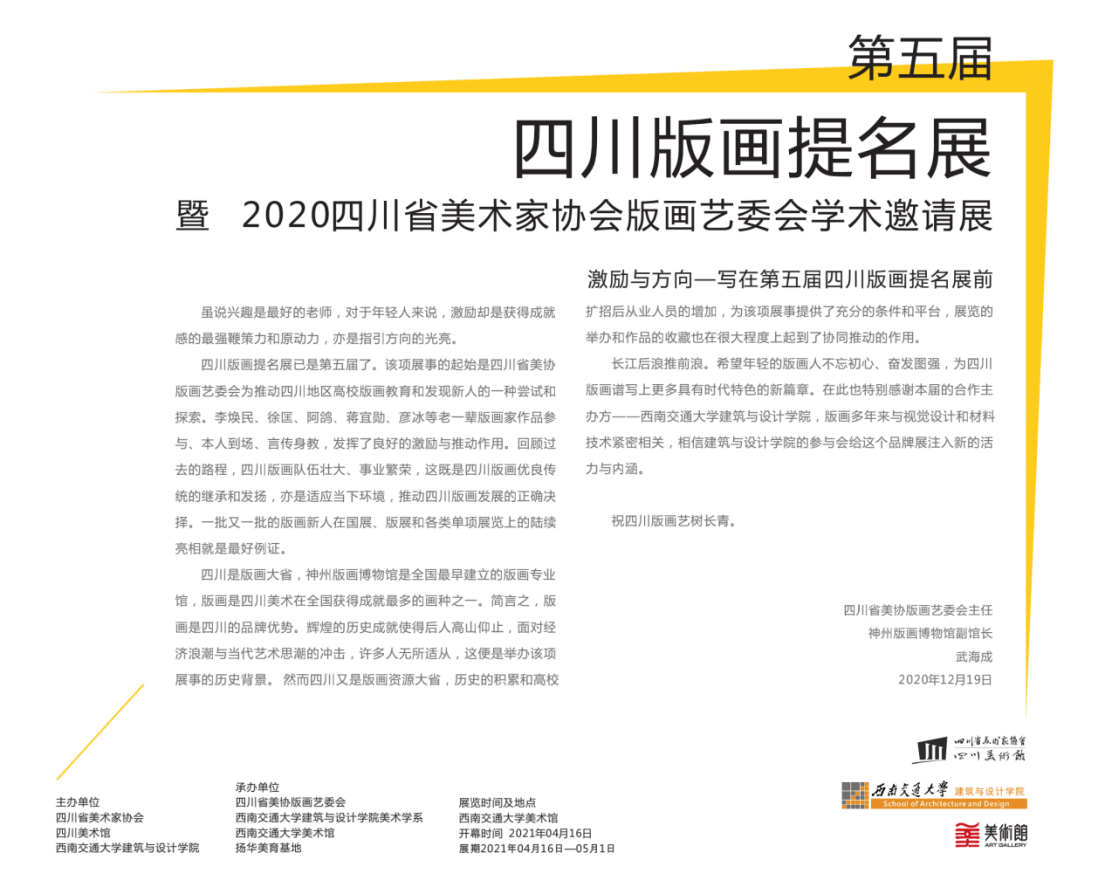 由四川省美术家协会、四川美术馆、太阳成集团tyc7111cc建筑与设计公司主办,四川省美术家协会版画艺委会、太阳成集团tyc7111cc建筑与设计公司美术学系、太阳成集团tyc7111cc美术馆承办的“第五届四川版画提名展”暨“2020年四川省美术家协会版画艺委会学术邀请展”于2021年4月16日在太阳成集团tyc7111cc美术馆隆重开幕。