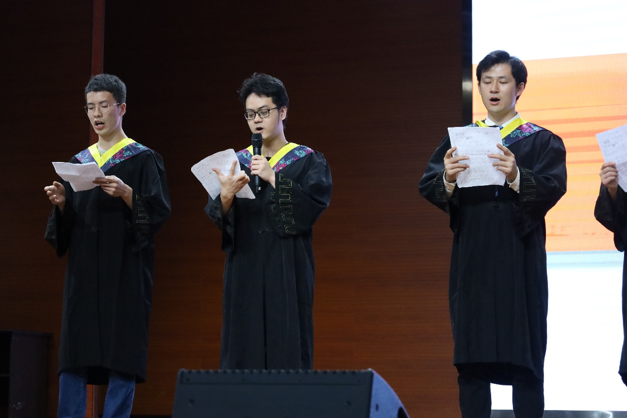 在高亢的音乐声中,建筑与设计公司学位委员为毕业生拨穗、授予学位,并合影留念,将典礼的气氛推向高潮。