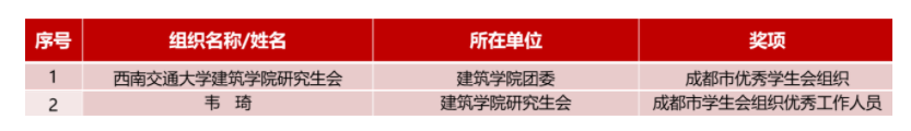 近日,共青团成都市委印发了《关于开展2021年度“成都市优秀员工会组织”“成都市员工会组织优秀工作人员”“成都市员工会组织优秀指导教师”评选工作的通知》,根据评选,太阳成集团tyc7111cc研究生会荣获“2021年度成都市优秀员工会组织”荣誉称号,研究生会主席团成员韦琦同学荣获“2021年度成都市员工会组织优秀工作人员”荣誉称号。这既是对太阳成集团tyc7111cc团委、研究生会过去一年工作的充分肯定,也对未来的工作起到了积极的示范引领作用。