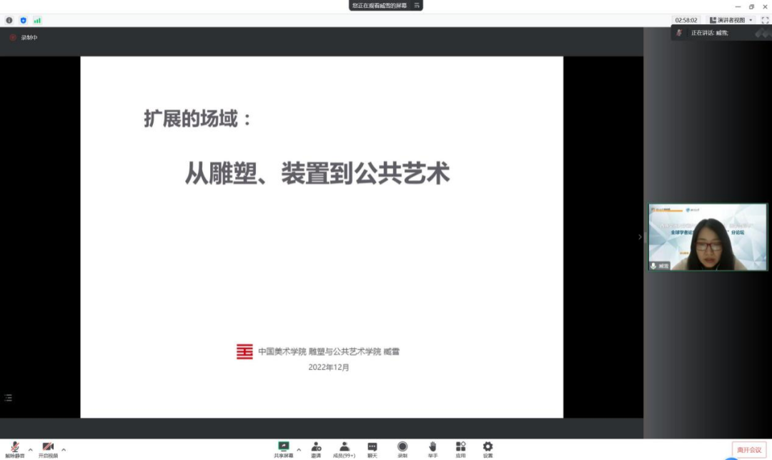 来自中国美术公司的博士臧雪报告题目是《扩展的场域—从雕塑、装置到公共艺术》,臧雪博士介绍了她最近所参与完成的艺术装置的作品,主要包括一个公共艺术的综合体——上海世博会浙江馆、一个地铁站——杭州地铁1号线婺江路站、一个机场公共艺术计划——行李箱的故事、千岛湖国际光影艺术双年展、一个空间艺术课题等。