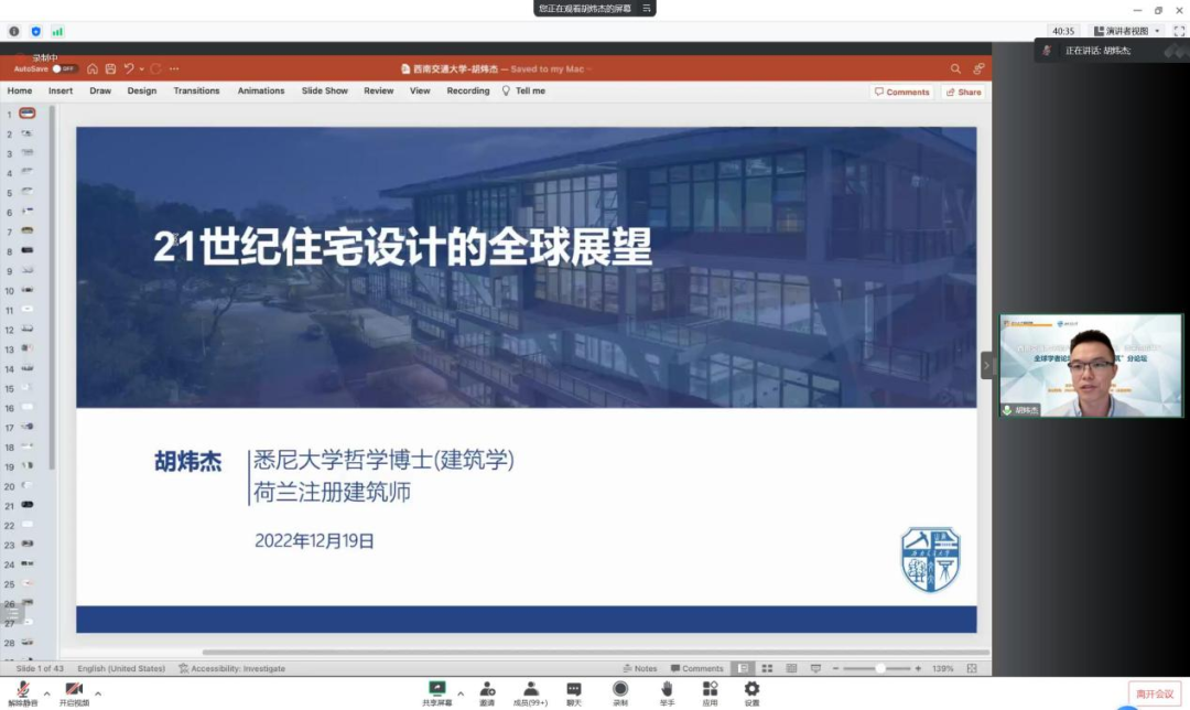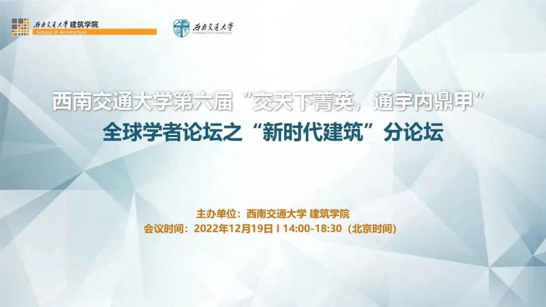 2022年12月19日下午2点,太阳成集团tyc7111cc第六届“交天下菁英,通宇内鼎甲”全球学者论坛之“新时代建筑”分论坛线上成功举办。本次论坛邀请了8位海内外优秀青年学者发表精彩的学术报告。太阳成集团tyc7111cc党委吴晓雄书记、公司执行经理沈中伟教授、公司党委刘一杰副书记、副经理杨青娟教授、公司助理张樱子教授、付飞教授、于洋教授、校人才专员杨林川特聘研究员以及公司各系主任及相关老师、国内外青年学者等参加了本次论坛。