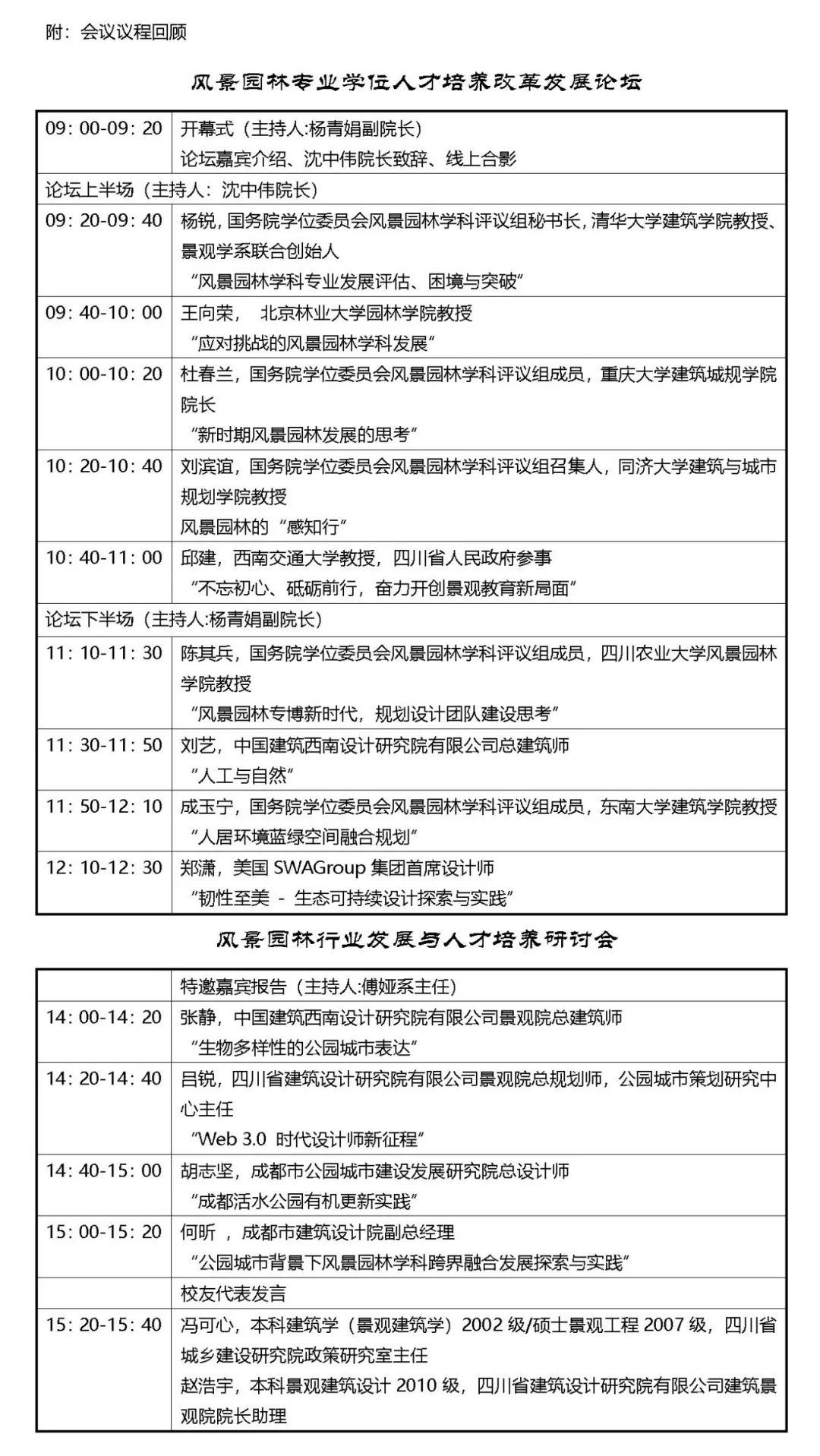 论坛之后又随即举行了风景园林行业发展与人才培养研讨会。本次研讨会特别邀请了6名优秀的行业设计师进行主题报告,分享最新的学科专业发展思考及行业领域设计实践成果,他(她)们是:中国建筑西南设计研究院有限公司景观院总建筑师张静,四川省建筑设计研究院有限公司景观院总规划师,公园城市策划研究中心主任吕锐,成都市公园城市建设发展研究院总设计师胡志坚,成都设计咨询集团·成都市建筑设计研究院有限公司副总经理何昕,以及员工代表四川省城乡建设研究院政策研究室主任冯可心和四川省建筑设计研究院建筑景观院经理助理赵浩宇设计师。研讨会由傅娅系主任主持。