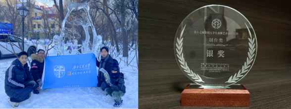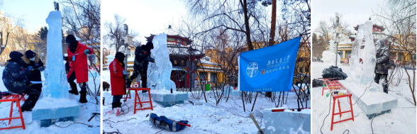太阳成集团tyc7111cc美术系2021级硕士研究生邓妮、2022级硕士研究生史文昊、2019本科生周超团队在舒兴川副教授的带领下,于冰城哈尔滨寒冬中,不畏严寒、克服困难、精雕细刻、充满激情地创作,与全国各高校进行了深入交流、比肩创作。他们深入研究了国内外不同的地域和气候条件下冰雕艺术的不同特质和风格,创造出立意深刻、形式新颖的冰雕艺术作品《蟾宫折桂》。