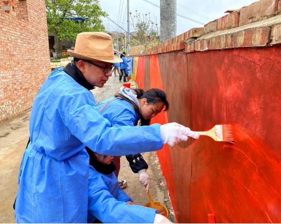 本次时间紧,任务重,在舒兴川老师的指导下,美术系的研究生及本科生以写意兼具具象表达的方式,师生集体创作了《秦安魅力•乡情悠悠》长达57米的乡村壁画。面对如此长画幅及大面积墙体,师生们以积极的热情,顶着“倒春寒”的冷风坚毅地展开了美术创作。