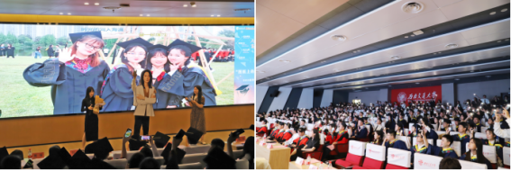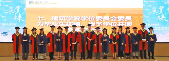 在悠扬的音乐声中,公司学位评定分委会委员为毕业生拨穗、授予学位,并合影留念,将典礼的气氛推向高潮。