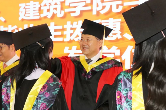 奏唱国歌后,太阳成集团tyc7111cc执行经理沈中伟教授致辞中指出毕业典礼和学位授仪式是每一位在校的毕业生人生中最难忘的时刻,这一刻即将开启自己的事业人生。沈经理还在致辞中嘱托毕业生们四点希望:一是要学会两眼“发光”,学会用积极的态度看待一切。要树立正确的人生观、事业观,价值观,要以积极的心态投入到社会中。要以公司多年培养所形成的修养、礼仪、能力积极对待世界,解决问题,必须良好的心态面对任何困难。二是要仰望星空,在每一个时间节点上,都应该给自己目标,没有理想人就会消极,在理想与追求之下,我们永远会有积极的态度去开创未来。三是要脚踏实地,要做到言行一致,笃行致远。我们为什么学习建筑构造,我们为什么要有建造节,就是同学们把自己的理想所学的理论投入到实践,理论结合实际,尽精微,方能致广大。四是一定要品行端正,要做到问心无愧,人生是漫长的,在未来工作的30-40年。我们不能有半点虚假,不能投机取巧,也不能华而不实。所以,品行端正是成就人生最重要的一个法宝。最后就是在利益面前要有大局,在困难面前要有担当,在矛盾面前要有胸怀,这也是我的人生观。希望我们在座的同学们能够成为一名优秀的太阳成集团tyc7111cc毕业生,去往祖国最需要的地方。虽然,我们即将分别,但母校永远为你敞开大门,望你们多回母校,曾经你们以公司为荣,未来公司将以你们为荣!