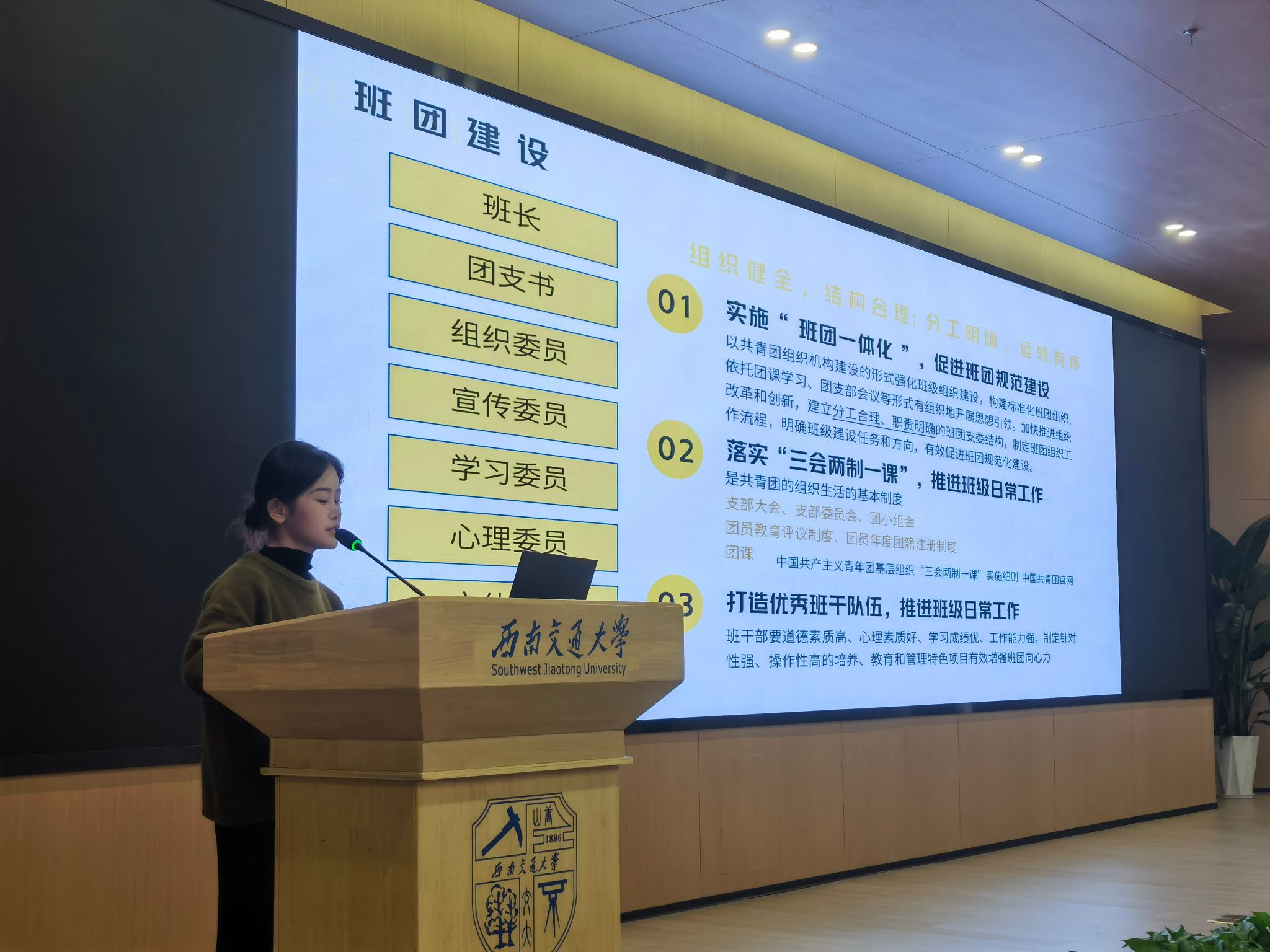 盛雨帆同学在简单自我介绍后,通过提问互动引入班团建设的主要内容:实施“班团一体化”,落实“三会两制一课”,推进班级日常工作。随后具体讲解了团支部书记、班长等班委的职责,强调了班委要组织健全、结构合理、分工明确、运转有序。