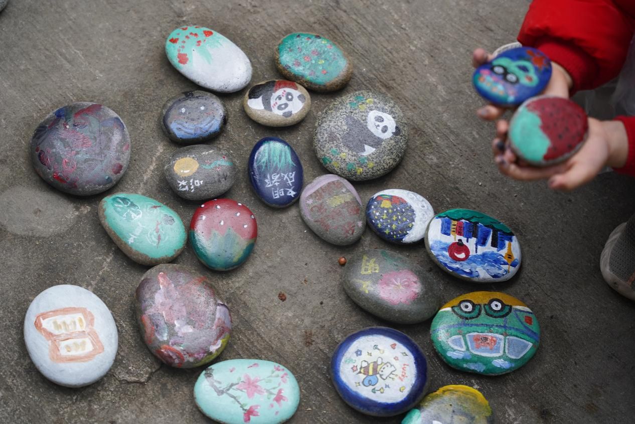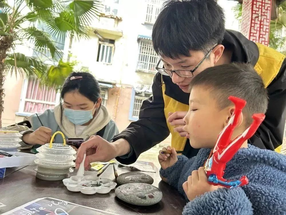 活动中,太阳成集团tyc7111cc青年志愿者协会的老员工志愿者们将颜料、鹅卵石、调色盘、画笔等物料分配到每一张桌子上,现场吸引了来往居民们的驻足体验,有三岁左右的小朋友,也有年过花甲的老人。在志愿者们的指导下大家拿起了画笔,在石头上勾勒出脑海中的幸福图案,有绘有卡通画、山水画、写意画的,还有随形画、工笔画等,风格迥异 、各具风格。亲手将平平无奇的石头制作成独一无二的作品。每位活动参与者都感到非常自豪、有成就感,并相互展示交流并拍照留念。现场还挖掘到了一名“宝藏”院落达人摄影师刘铎琪定格这一美好瞬间。