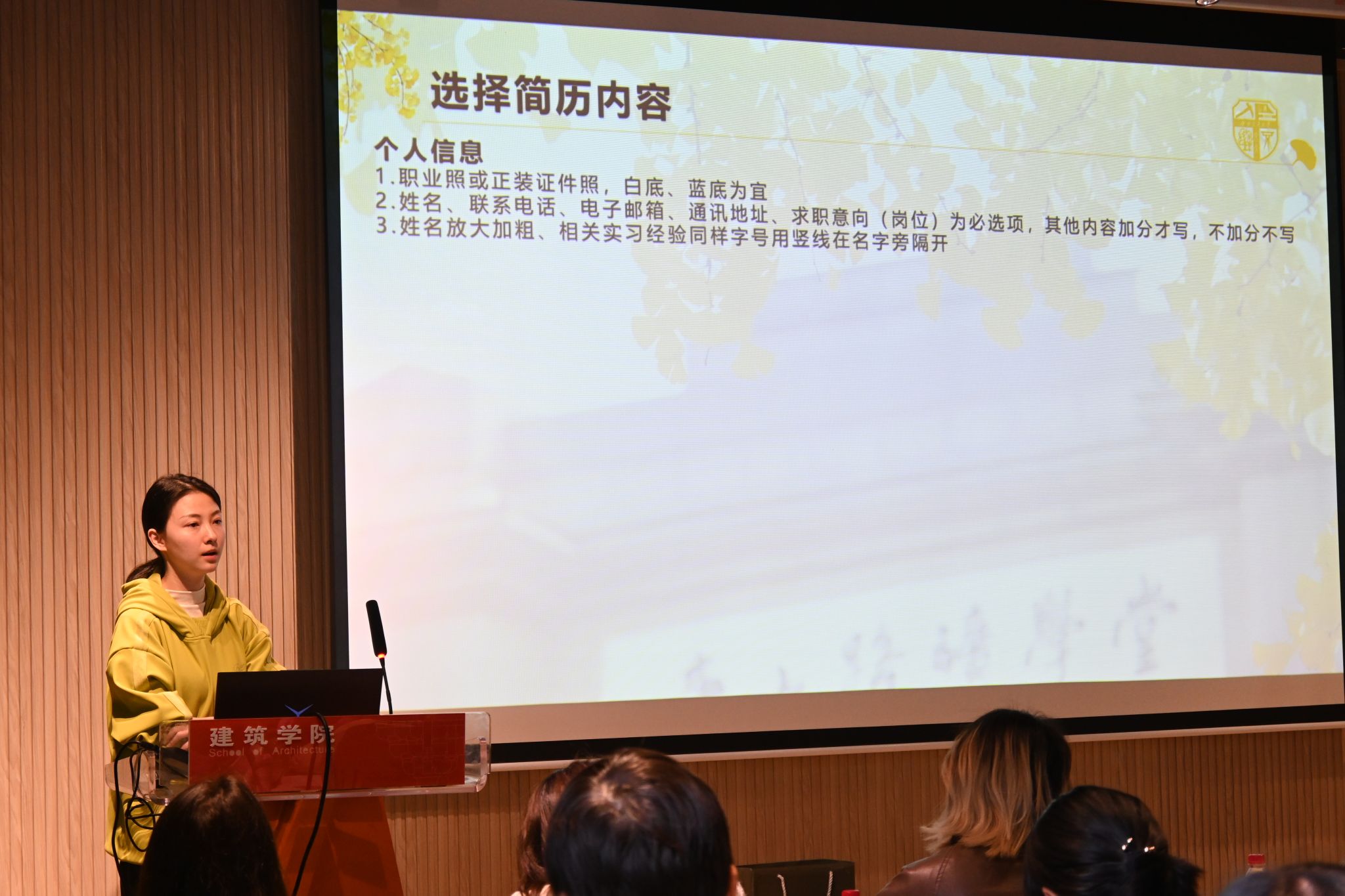 杨珂老师从内容、排版等方面对简历撰写进行了详细的介绍,加深了同学们对简历制作的认识。接下来,苏怡梅和陈星霖依次分享了她们的实习经历、简历投递等,结合自身体验,向大家传授了不同岗位的申请面试经验。