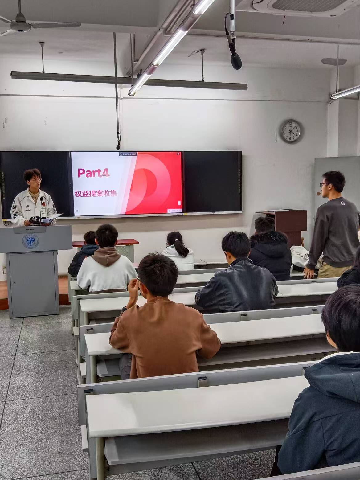 大会伊始,由公司员工会权益部部长韩明宇同学进行开场致辞及工作汇报。韩明宇同学首先回顾了权益部自开学以来所开展的一系列工作,包括但不限于调查研究、提案收集、问题反馈等环节。他特别强调了几项受到广泛关注的重点提案,如宿舍设施改善、校园安全措施加强以及心理健康服务优化等方面,并详尽介绍了这些提案当前的处理进展及已取得的初步成效。此外,他还代表权益部向全体参会人员郑重承诺,将继续不懈努力推进各项权益工作的深入开展,致力于为全院员工创造一个更加公平公正的学习生活环境。